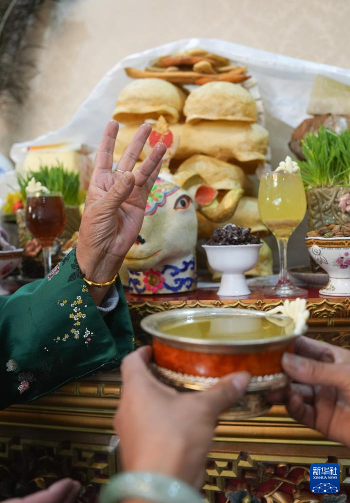 2月28日,身著藏裝的拉薩市民在吃寓意五谷豐登的“切瑪”。新華社記者 晉美多吉 攝