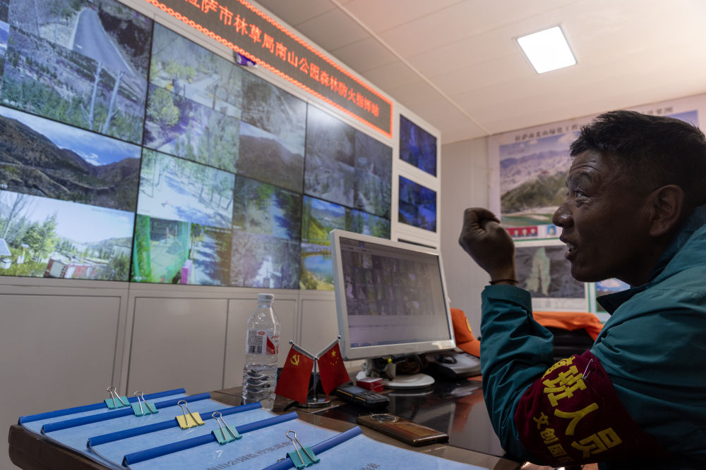 拉薩南山公園園區(qū)護(hù)林員扎西曲培正在監(jiān)控室觀察園區(qū)各處情況(3月20日攝)。新華社記者姜帆 攝