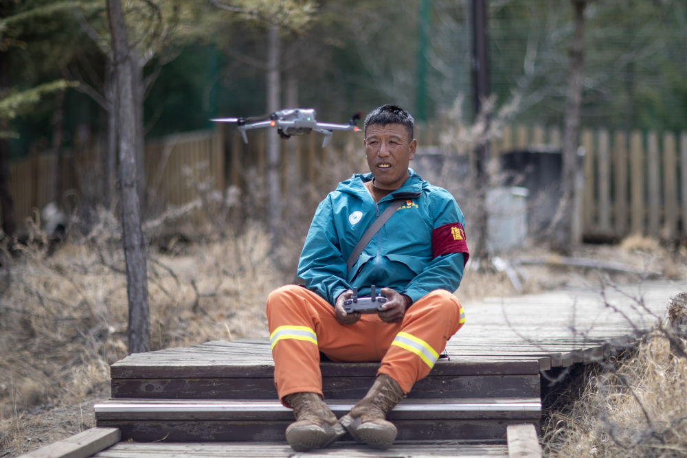 拉薩南山公園園區(qū)護(hù)林員扎西曲培正在操控?zé)o人機(jī)(3月20日攝)。新華社記者姜帆 攝
