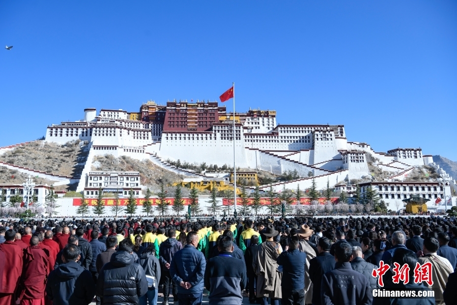 3月28日,西藏各族各界人士聚集在拉薩布達(dá)拉宮廣場,升國旗、唱國歌,參加西藏百萬農(nóng)奴解放66周年紀(jì)念活動。圖為升國旗儀式現(xiàn)場。
