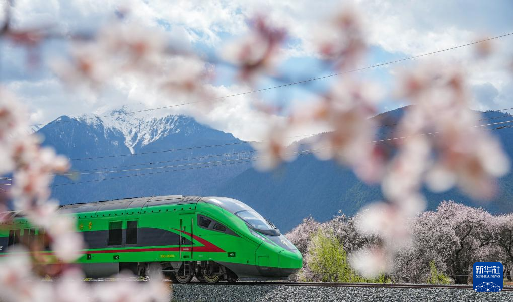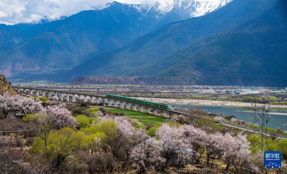 當(dāng)列車駛?cè)肓种ゾ硟?nèi),桃花的盛景會達(dá)到高潮,野生桃花漫山遍野。車在花中跑,人在畫中游,馳騁的復(fù)興號動車與鐵道旁盛開的桃花構(gòu)成了一幅人與自然和諧共生的畫卷?!暗谝淮慰吹綇?fù)興號從眼前飛馳而過,就像看見家鄉(xiāng)的雄鷹掠過雪山。”林芝站安檢員德吉拉姆說。