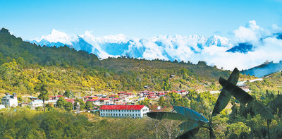 格林村與遠(yuǎn)處的雪山、近處的森林共同構(gòu)成一幅生態(tài)畫卷。黃家斌攝