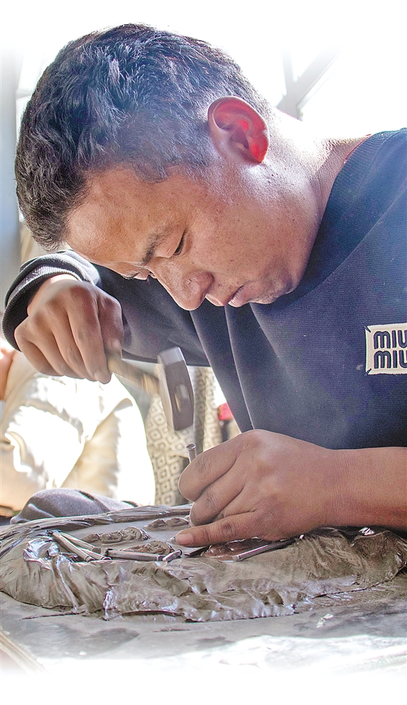 圖為南木林縣孜東金銅制佛古藝中心的手藝人在制作銅工藝品。