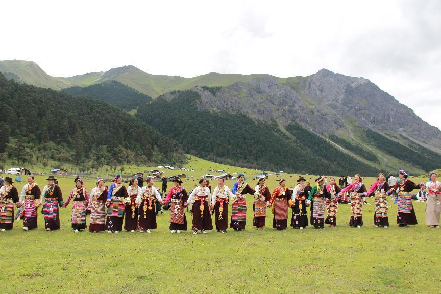 作品簡介:賽馬節(jié)期間,身著民族服飾的西藏女性群體在草地上一字排開,歡騰起舞。