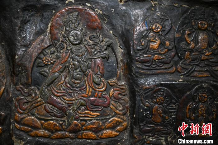 4月27日,記者探訪了當(dāng)雄縣貢堂鄉(xiāng)沖嘎?tīng)柎蹇雕R寺的瑪尼拉康?,斈崂凳窃撍鲁扌卸粗獾脑缙谧诮袒顒?dòng)場(chǎng)所,也是寺院里最古老的建筑。這里保存著令人驚嘆的石刻造像墻,這些石刻距今已有三百年歷史?,斈崂低庥^普通,但其室內(nèi)六面墻上整齊地貼滿了浮雕石刻板,共計(jì)1213塊(僅一塊缺失)。石刻內(nèi)容豐富,涵蓋了藏傳佛教各宗各派的本尊、祖師、佛母菩薩等,造型多姿多樣,線條清晰流暢。這處石刻造像墻對(duì)于研究西藏傳統(tǒng)雕刻、藏傳佛教以及歷史具有重大意義。中新社記者 貢嘎來(lái)松 攝