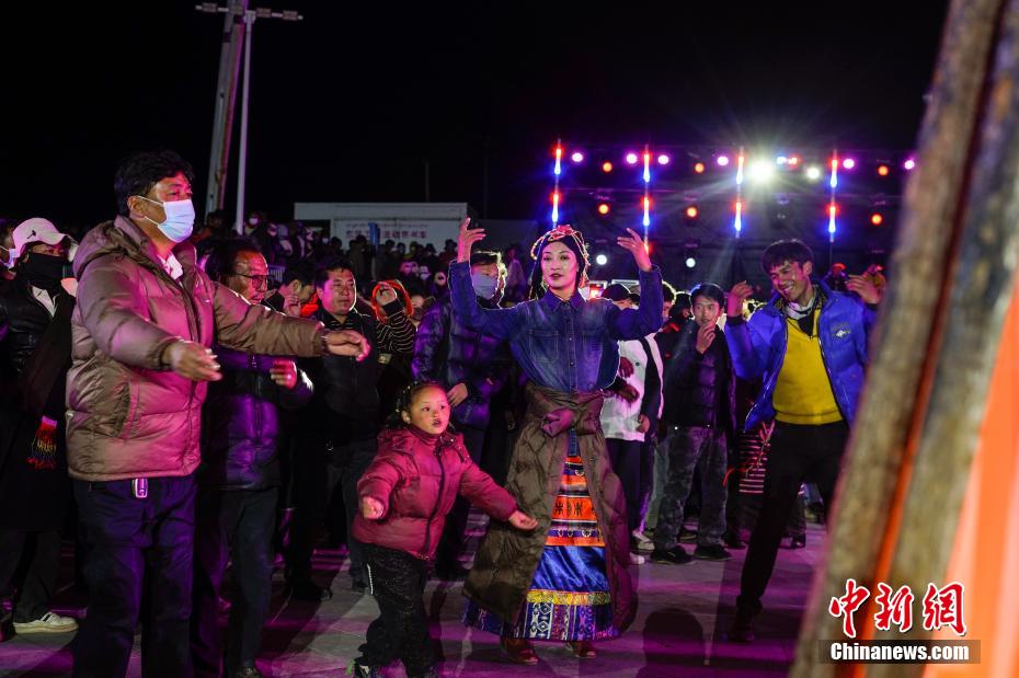 圖為來(lái)看賽馬的觀眾圍著篝火跳起鍋莊舞。中新社記者 貢嘎來(lái)松 攝