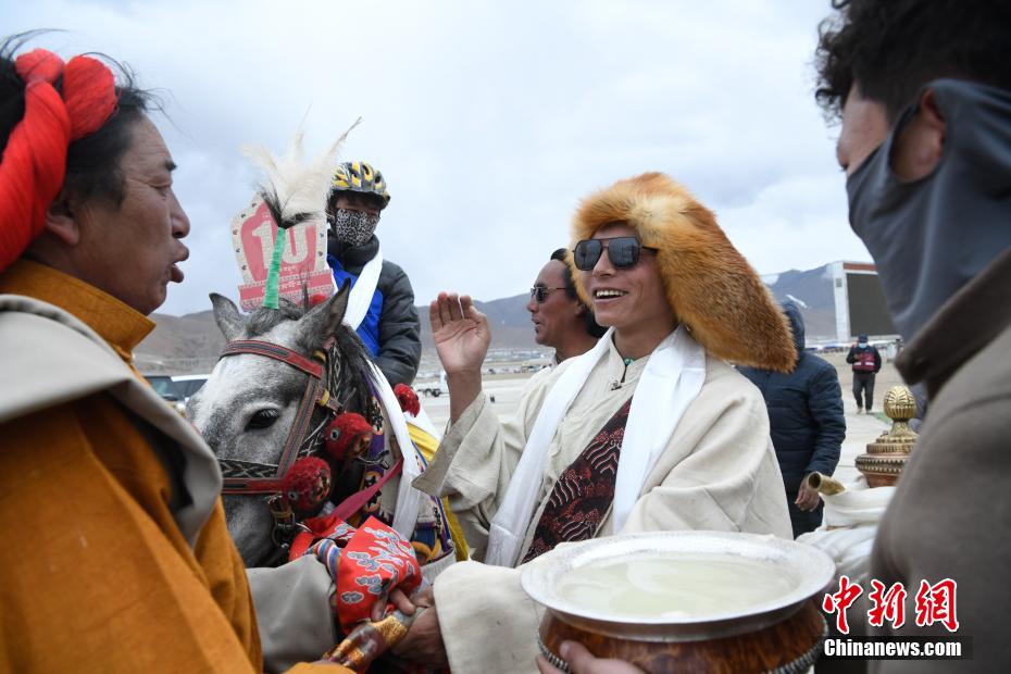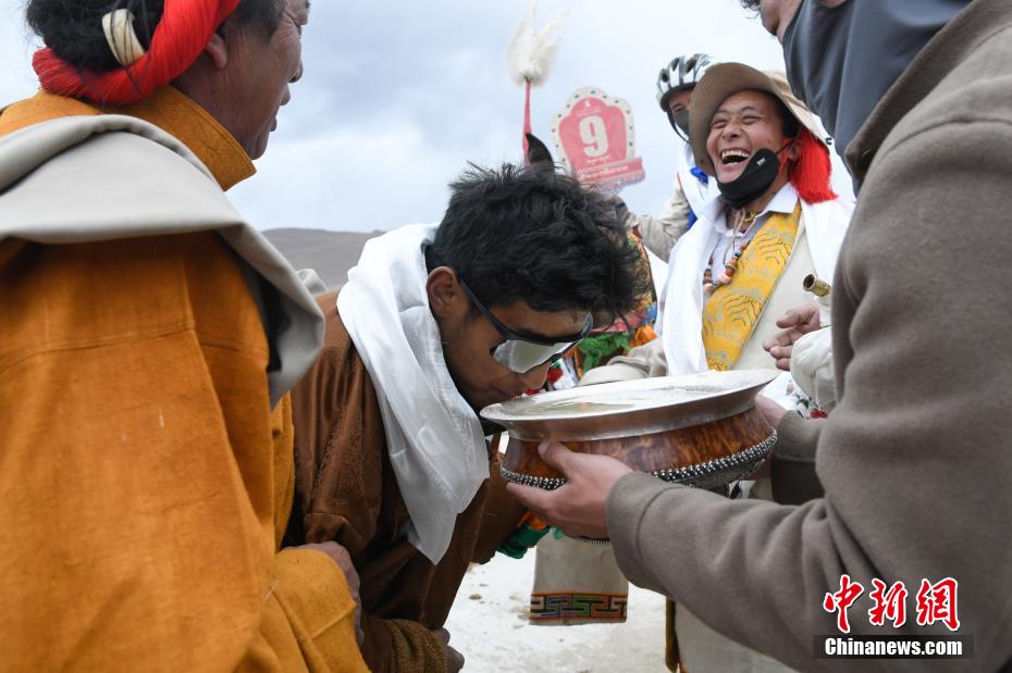 圖為頒獎(jiǎng)儀式上馬主喝青稞酒慶祝。中新社記者 貢嘎來(lái)松 攝
