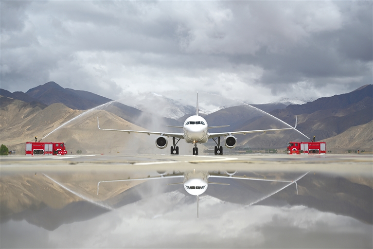 圖為5月1日,“上?!湛t”航線首航飛機(jī)在日喀則和平機(jī)場(chǎng)通過(guò)水門(mén)。記者 扎西頓珠 攝