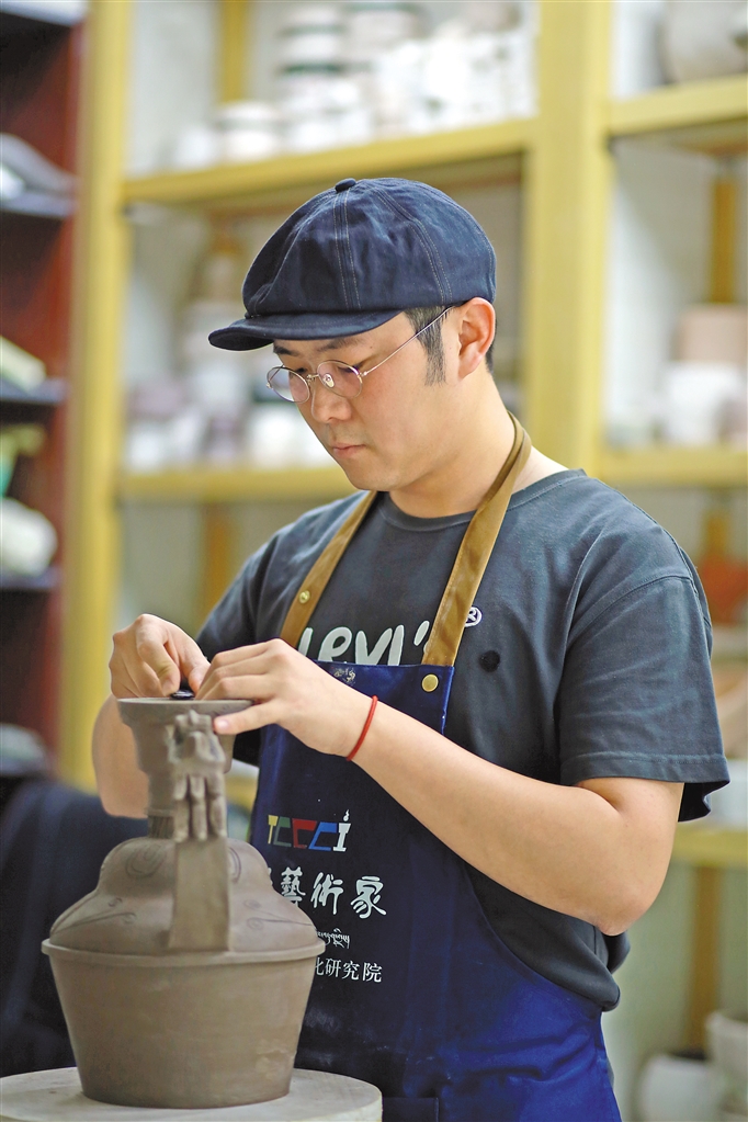 圖為雪堆白技工學校陶瓷工作室老師王竹在進行藏式器皿的設(shè)計與制作。
