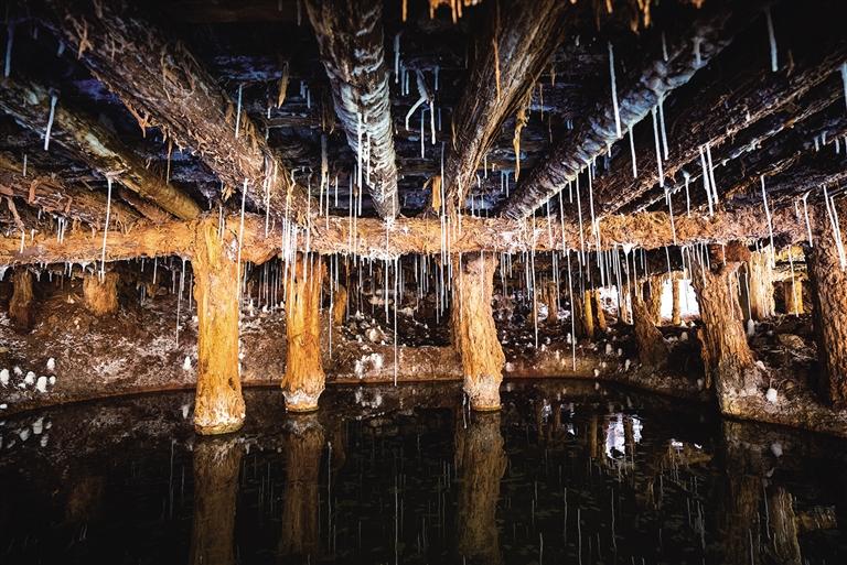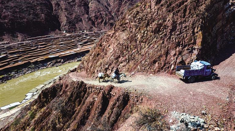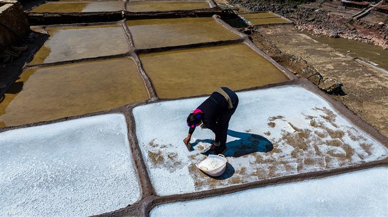 鹽田上,60歲的乃柯正和丈夫一起用木拍夯實鹽田。“現(xiàn)在用泵抽水輕松多了,但拍鹽田的手藝不能丟?!崩先说脑捳Z中,既有對科技的接納,也有對傳統(tǒng)的堅守。鹽田下方,鹽晶垂落成簾,在山風(fēng)拂動下閃爍微光,仿佛在訴說著千年文明的厚重。