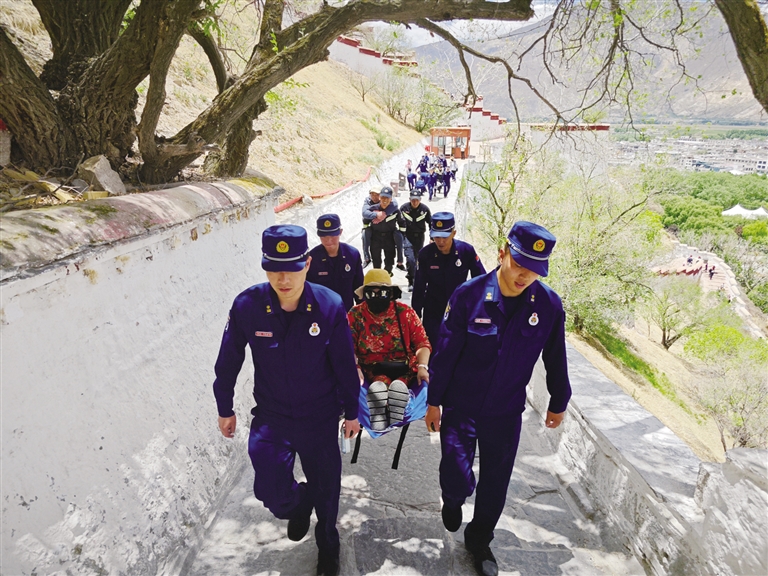 消防員用擔架抬著殘疾人士參觀布達拉宮。