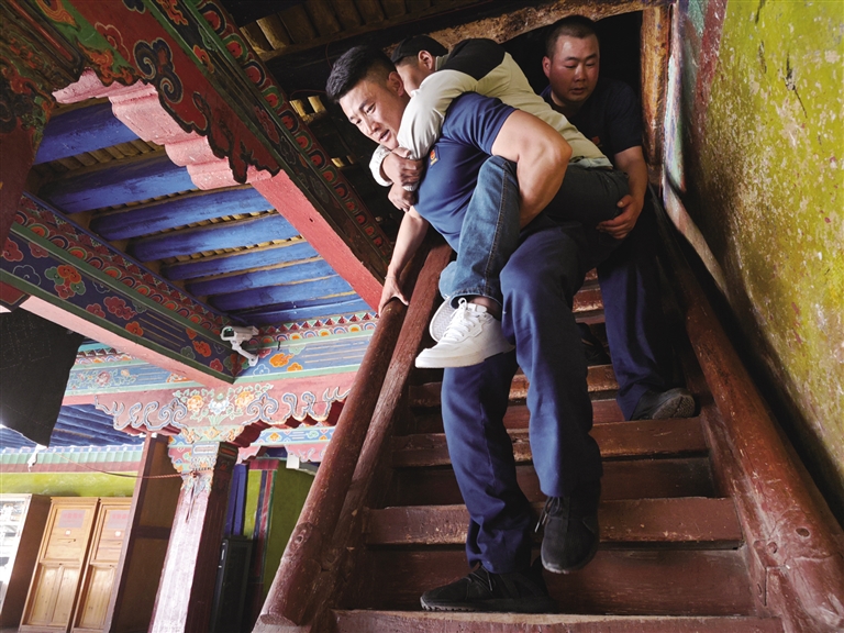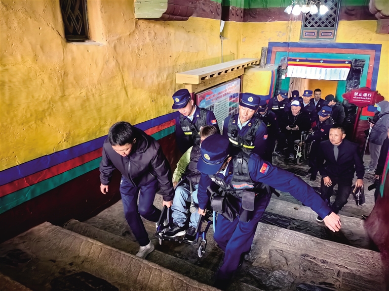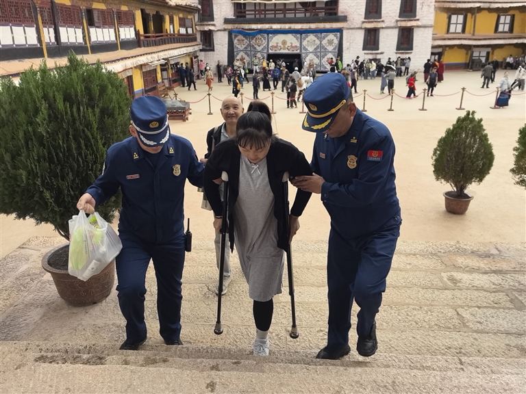 消防員幫助殘疾人士參觀布達拉宮。圖由拉薩市布達拉宮消防救援站提供