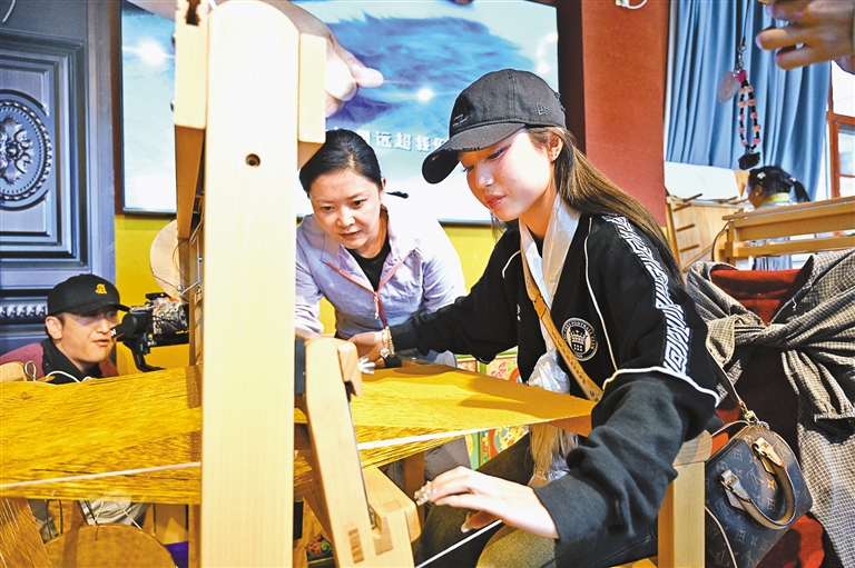 在江孜縣“阿佳格桑工坊”,工坊負責人阿佳格桑和江孜縣群團工作部黨組書記、部長央吉向剛到的日本游客獻上潔白的哈達,歡迎遠道而來的客人。走進工坊,游客們被精美的藏族氆氌技藝震撼,看著藏族婦女正在編織,便躍躍欲試。在央吉的帶領下,日本游客紛紛踏上編織機,有模有樣地學起了編織,豎起拇指稱贊不斷。