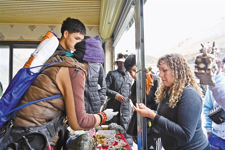 新奇感過后,游客們開啟購物模式?!鞍⒓眩@個掛飾可以定制嗎?”“你們可以發(fā)快遞嗎?”對于一連串的問題,阿佳格桑忙碌地一一回答著,“你們想要什么圖形,我們就給你定制什么圖形。”“我們這兒快遞很快,今天下單明天就給你發(fā)!”短短半個小時,“阿佳格桑工坊”的生意火爆,銷售藏式靠墊、藏式地毯、掛飾等特色產(chǎn)品4000多元?!盎厝ズ?,我要通過自媒體平臺,宣傳這次西藏之旅的所見所聞,讓更多親朋好友來西藏旅游!”日本游客琴音有感而發(fā)。