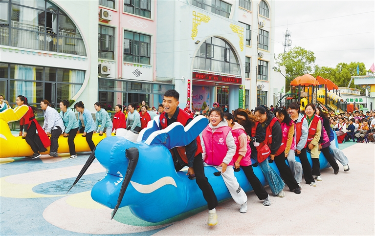 嘎瑪貢桑社區(qū)干部和拉薩市實(shí)驗(yàn)幼兒園東城分園的教師參加“劃龍舟”比賽。
