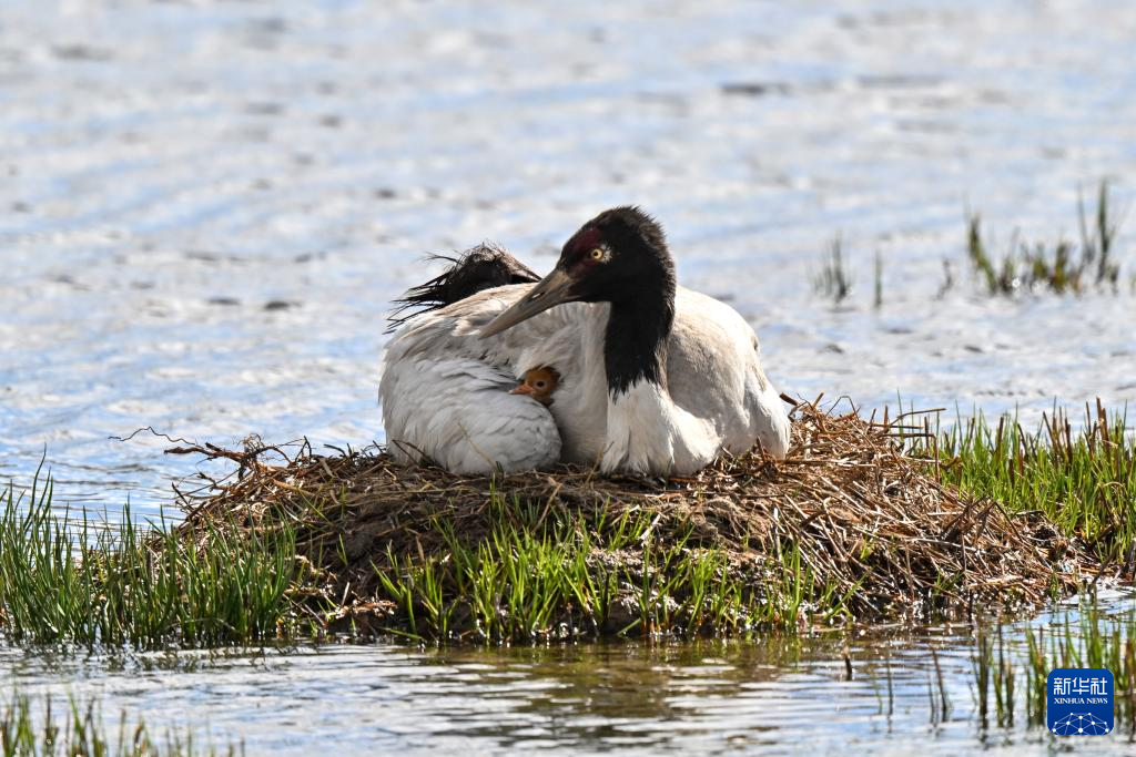一對黑頸鶴在那曲市申扎縣的濕地上照顧剛出殼的雛鳥,一只將其護在身下保持溫暖,另一只則在旁保持警戒(6月4日攝)。新華社記者 姜帆 攝