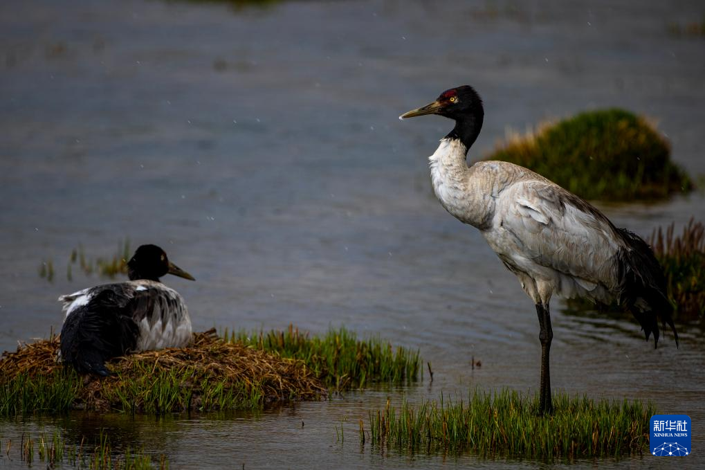 6月4日拍攝的在那曲市申扎縣周邊濕地里棲息的黑頸鶴。新華社記者 旦增尼瑪曲珠 攝