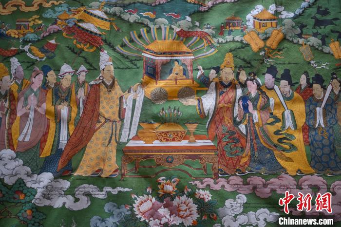 唐卡是藏民族獨特的藝術(shù)形式,承載千年信仰與智慧,是世界非物質(zhì)文化遺產(chǎn)明珠。本次展覽的核心展品《吐蕃贊普世系大唐卡金子明鏡》尤為引人注目。該唐卡寬1.8米、長200米,由平措多布杰大師等30多位孜東唐卡畫師歷經(jīng)9年繪制完成。它依據(jù)史實,描繪了文成公主和金城公主入藏、長慶會盟等重要事件,生動呈現(xiàn)各民族在文化、政治、經(jīng)濟(jì)等方面的交流交融,是孜東唐卡藝術(shù)保護(hù)成果。