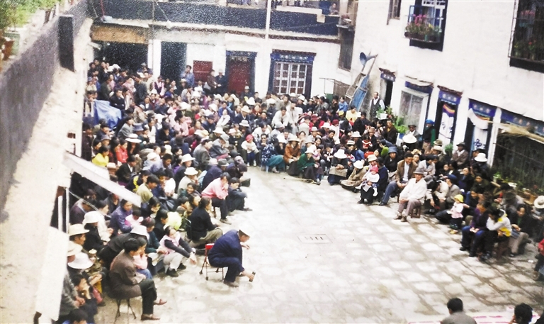在當(dāng)時(shí)拍的另一張照片上,幾十位居民擠在過道里準(zhǔn)備投票?!澳菚r(shí)候院子小,選舉時(shí)得側(cè)著身子站?!钡录扛禄貞浀溃霸鹤诱?,雨天積水,但絲毫不影響大家參與社區(qū)事務(wù)的熱情。”照片的一角,13歲的普布普赤正躲在母親身后好奇張望,如今她41歲,已成長(zhǎng)為大院的戶長(zhǎng)。