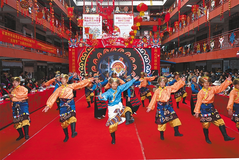 2025年2月23日,吉崩崗街道德賽大院開展慶元宵活動(dòng),雪巴拉姆藝術(shù)團(tuán)舞蹈演員正在表演節(jié)目。(資料圖片)