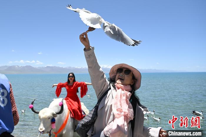 圖為游客在納木錯湖邊拍照游玩。中新社記者 貢嘎來松 攝