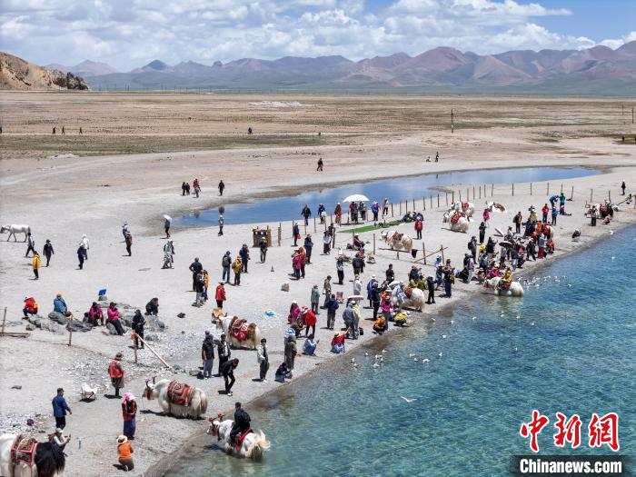 6月26日,隨著氣溫逐漸升高,西藏納木錯迎來旅游旺季。納木錯,藏語意為“天湖”,位于西藏自治區(qū)中部,拉薩市當雄縣和那曲市班戈縣之間,面積超2000平方公里,湖面海拔4718米,是世界海拔最高的大型咸水湖。圖為游客在納木錯湖邊拍照留念。中新社記者 貢嘎來松 攝