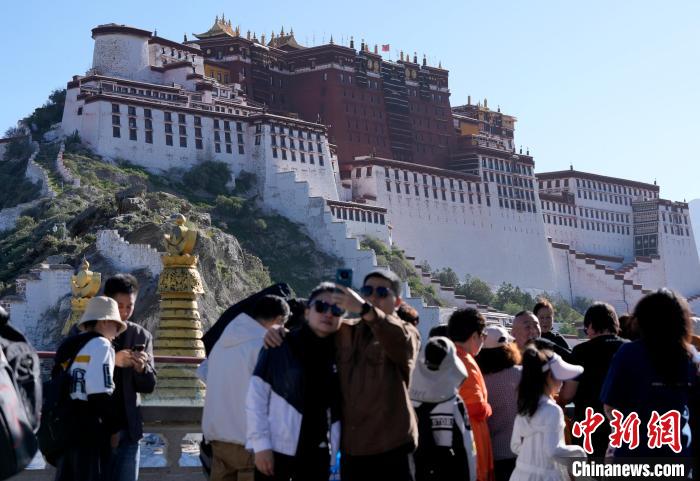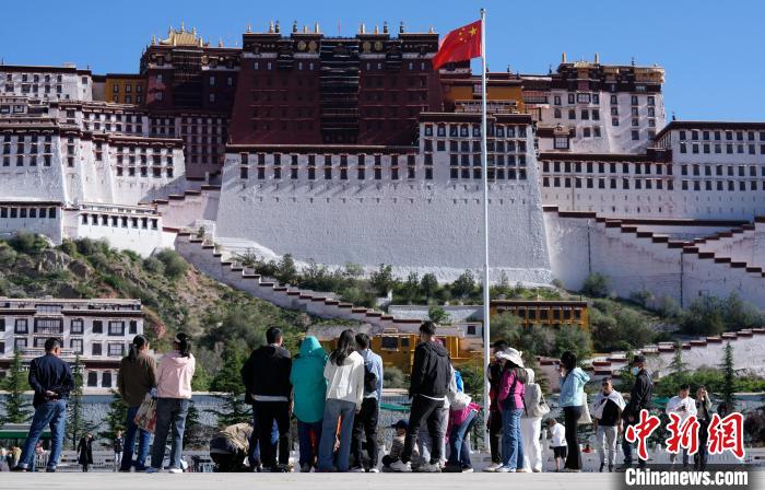 圖為游客在布達(dá)拉宮廣場(chǎng)拍照。中新社記者 李林 攝