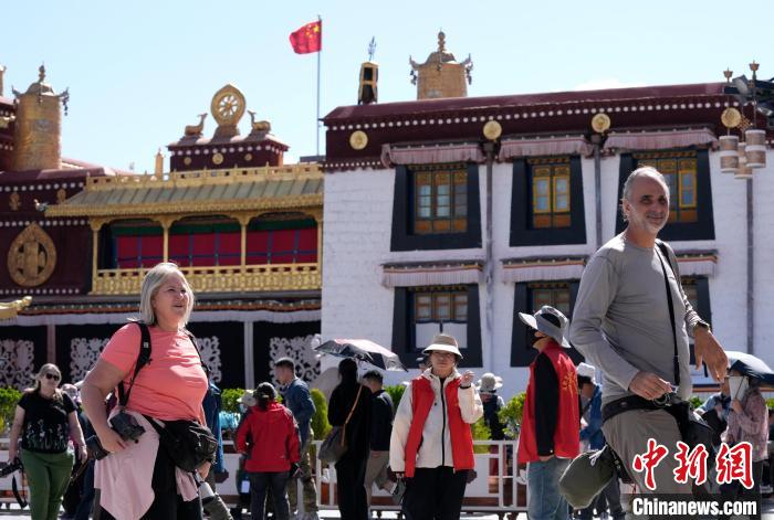 圖為外國(guó)游客在大昭寺廣場(chǎng)游覽。中新社記者 李林 攝