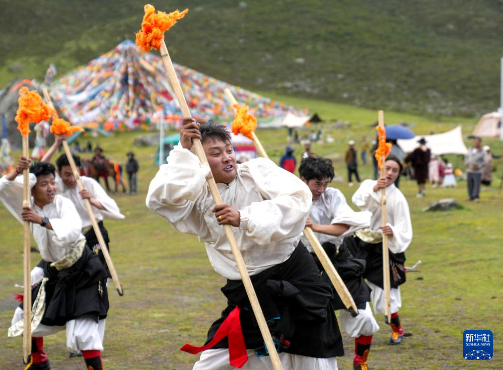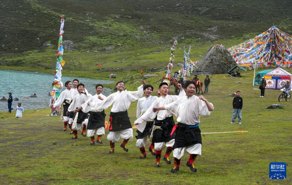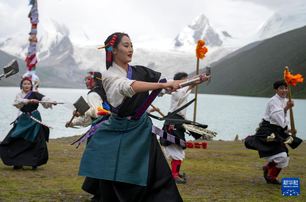 西藏那曲市比如縣藝術(shù)團(tuán)的演員在薩普雪山景區(qū)為游客表演國(guó)家級(jí)非物質(zhì)文化遺產(chǎn)舞蹈“達(dá)布阿諧”(7月19日攝)。這是該藝術(shù)團(tuán)今年在景區(qū)開(kāi)展的第6場(chǎng)非遺展演活動(dòng)。新華社記者 晉美多吉 攝