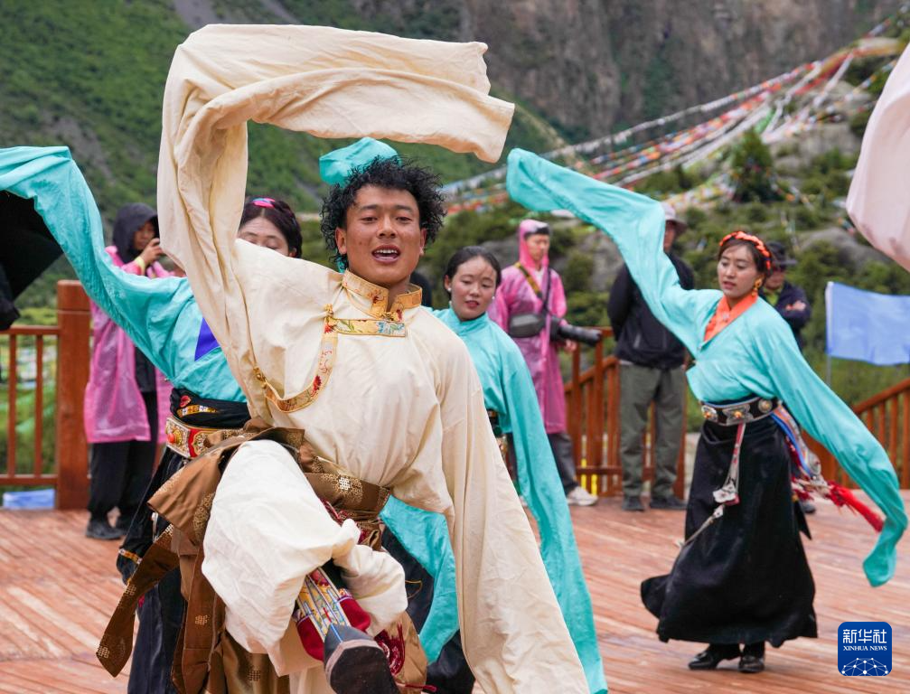 邊壩縣普玉一村的文藝隊(duì)演員在“三色湖”觀景臺(tái)上為游客表演鍋莊(7月20日攝)。新華社記者 晉美多吉 攝