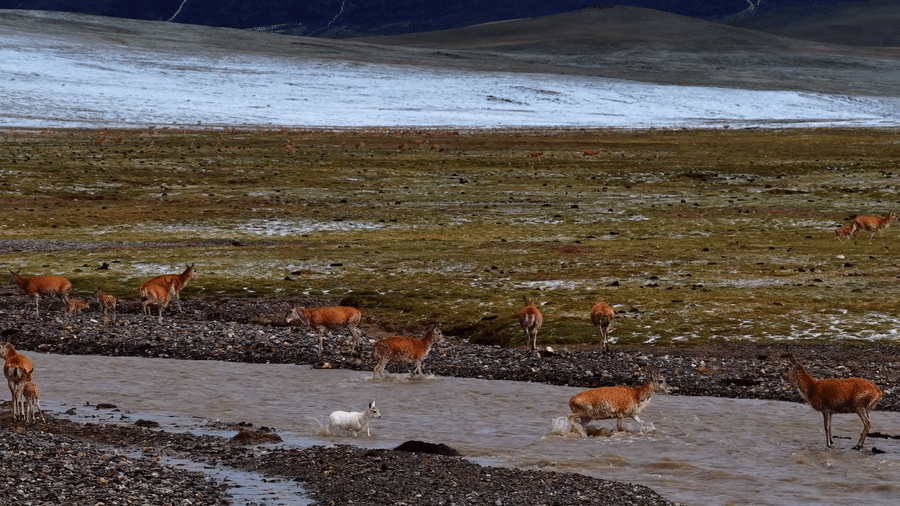 近日,藏羚羊群中,一只罕見的白色小藏羚羊緊隨母親,踏過河水順利抵達對岸,雪白的身影在群中格外醒目。