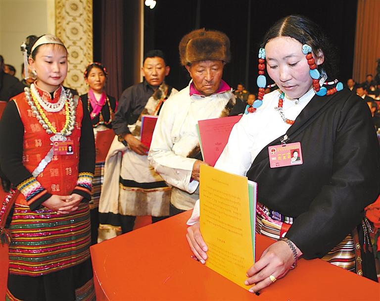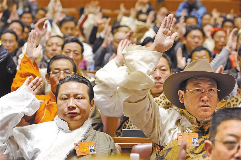 在舊西藏,占總?cè)丝诓坏?%的三大領(lǐng)主(官家、貴族和寺院上層僧侶)占有全部生產(chǎn)資料,而占總?cè)丝?5%以上的農(nóng)奴和奴隸沒有人身自由。西藏民主改革特別是西藏自治區(qū)成立以來,民族區(qū)域自治制度得到堅(jiān)決貫徹,各族人民參與民主政治建設(shè)的熱情持續(xù)高漲:農(nóng)奴的后代當(dāng)選人大代表,通過人民代表大會(huì)制度參與國家治理;截至目前,全區(qū)四級(jí)人大代表42000余人中,藏族和其他少數(shù)民族約占89%;門巴、珞巴等人口不足萬人的民族,在全國及西藏人大均有代表——雪域高原各族兒女依法行使民主權(quán)利,真正成為命運(yùn)的主宰者。