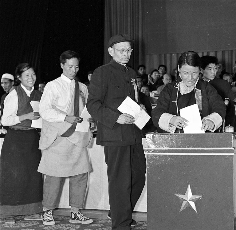 圖為代表們?cè)谖鞑刈灾螀^(qū)第一屆人民代表大會(huì)上投票(1965年攝)。