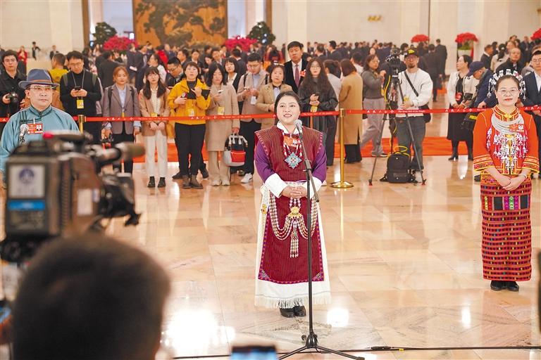圖為住藏全國政協(xié)委員白瑪玉珍(中)在“委員通道”上介紹墨脫的發(fā)展變化(2025年3月攝)。