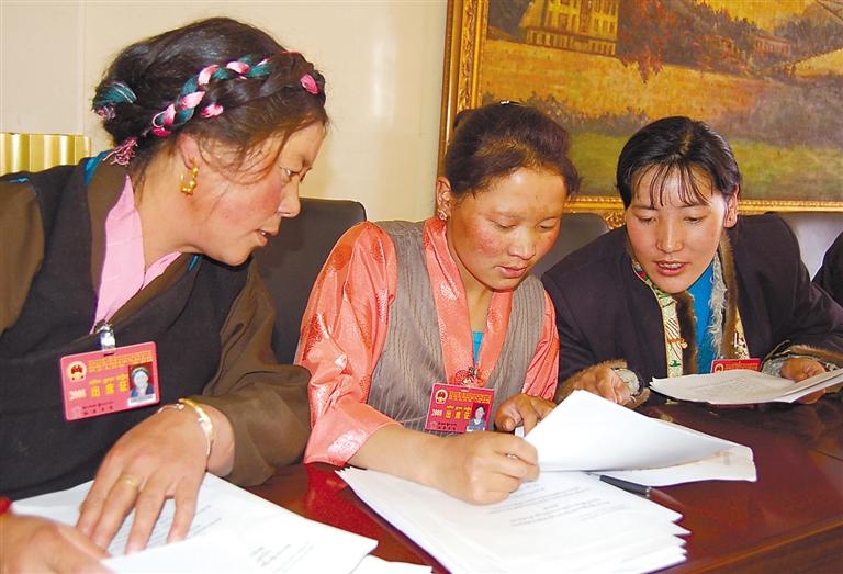 圖為西藏自治區(qū)九屆人大一次會(huì)議期間,來自拉薩市的格桑卓嘎、洛桑卓嘎、梅朵卓瑪三位代表一起審議政府工作報(bào)告(2008年攝)。