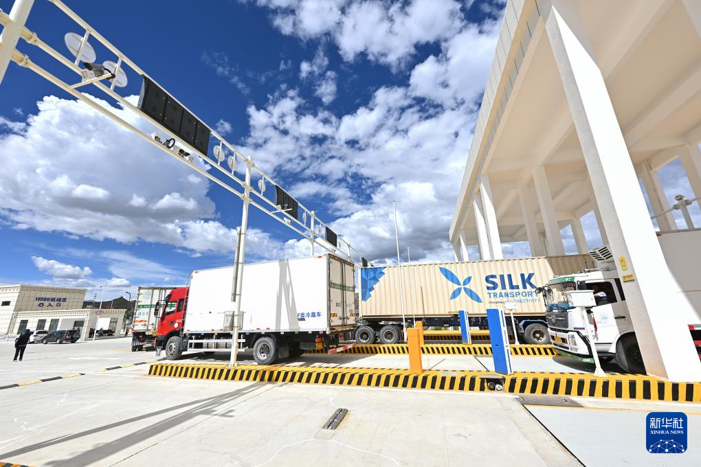 7月16日,貨車通過日喀則國(guó)際陸地港出口貨物查驗(yàn)場(chǎng)卡口。新華社記者 李鑫 攝