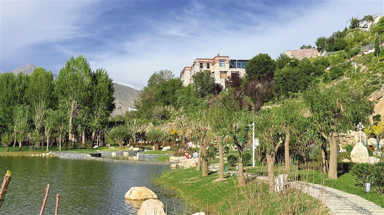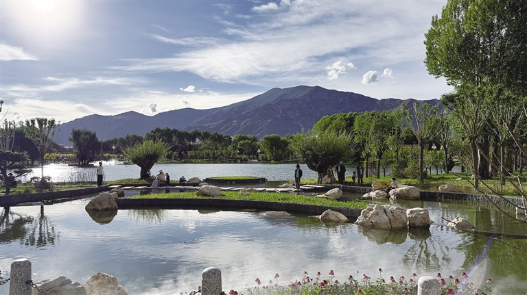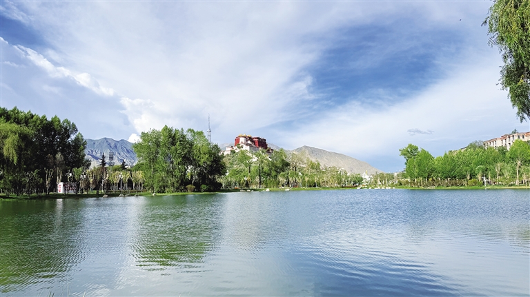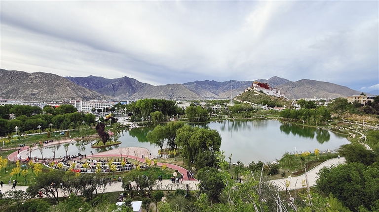 拉薩團結公園坐落于布達拉宮西麓、藥王山腳下。昔日,這里房屋高低錯雜、線纜交錯密布、市場喧鬧擁擠、環(huán)境喧囂擾攘,不僅影響城市形象和生態(tài)環(huán)境,還影響出行游玩體驗。如今,湖水如碧綢般清澈,岸邊綠樹成蔭,各類花卉競相綻放,昔日雜亂之地已蛻變?yōu)轸浯涿髦椋宋墓袍E與自然景致相映成趣,共同繪就出“百澤繞城·水城相依”的生態(tài)文明畫卷。
