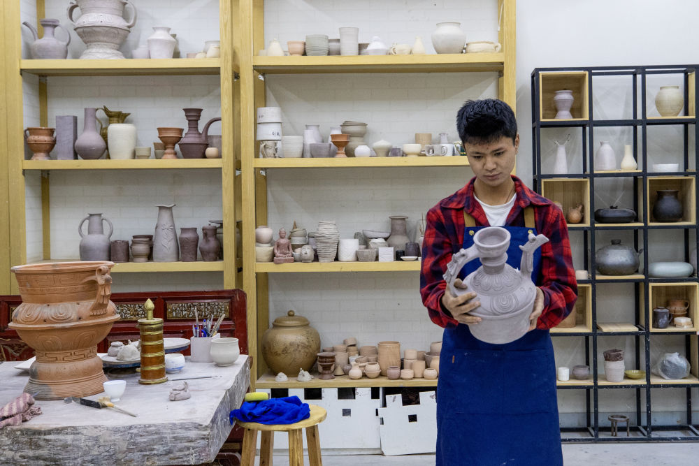 8月6日,一名制陶師在欣賞自己的作品。藏族傳統(tǒng)泥陶雕塑制作技藝入選西藏自治區(qū)級非物質文化遺產代表性項目名錄。