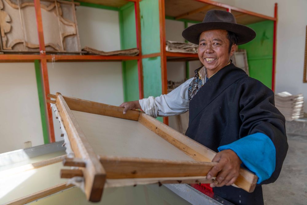 8月12日,雪拉藏紙制作技藝自治區(qū)級代表性傳承人格桑旦增在制作藏紙。
