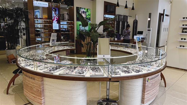 在南樓一層,瑞幸咖啡的藍(lán)色招牌與霸王茶姬的紅色燈籠相映成趣,構(gòu)筑起高原最強(qiáng)的咖啡茶飲矩陣。澳免國(guó)際美妝區(qū)內(nèi),蘭蔻、雅詩(shī)蘭黛等全球品牌專柜整齊陳列,產(chǎn)品與區(qū)外同步上新且價(jià)格一致。明廊永視眼鏡店的乳白色柜臺(tái)前,驗(yàn)光設(shè)備閃爍著科技微光,負(fù)責(zé)人彭春永介紹:“升級(jí)后加裝了藏式紋樣屏風(fēng),自動(dòng)門和LED屏讓老店煥發(fā)新顏?!?/p>