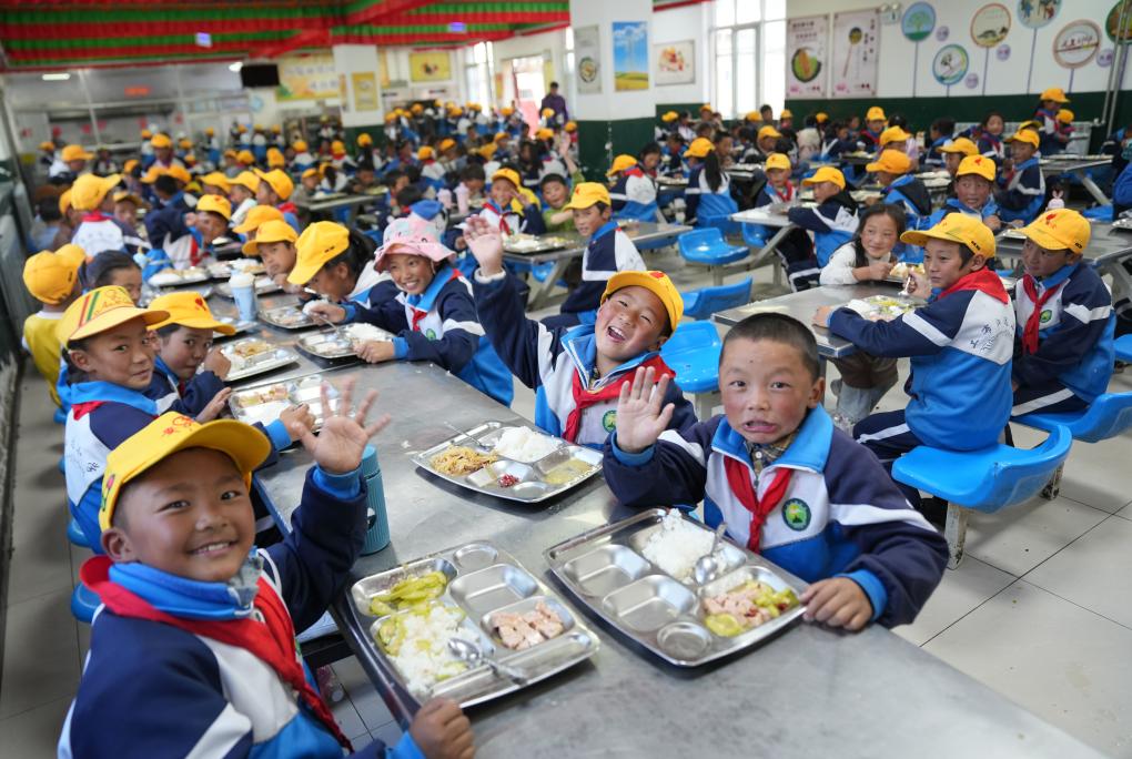 2024年9月3日,西藏林芝市工布江達(dá)縣娘蒲鄉(xiāng)中心小學(xué)的學(xué)生們?cè)谙碛梦绮汀P氯A社記者 晉美多吉 攝
