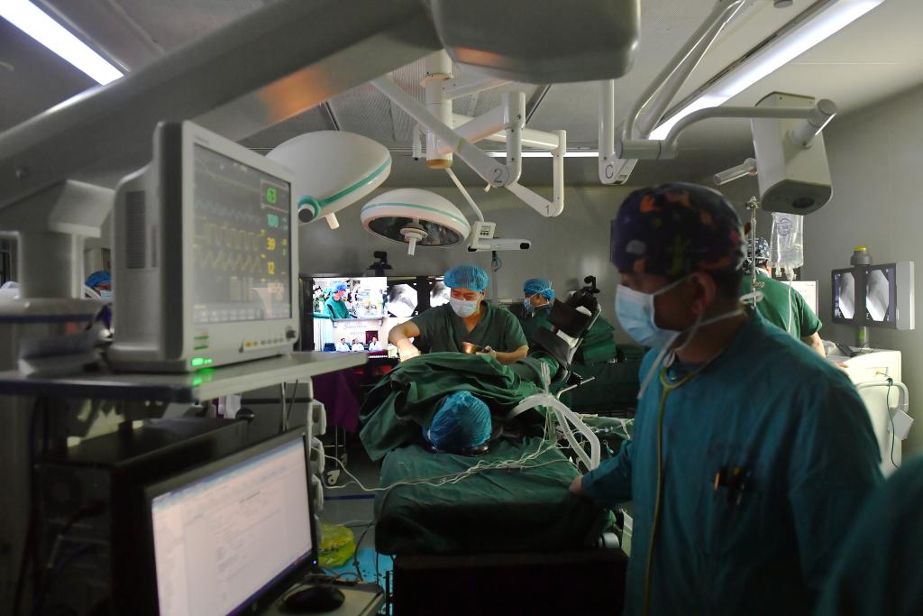 2021年4月19日,拉薩市人民醫(yī)院骨科醫(yī)生在北京積水潭醫(yī)院專(zhuān)家遠(yuǎn)程指導(dǎo)下使用骨科機(jī)器人開(kāi)展骨科手術(shù)。 新華社記者 孫瑞博 攝