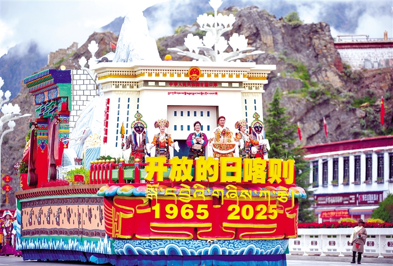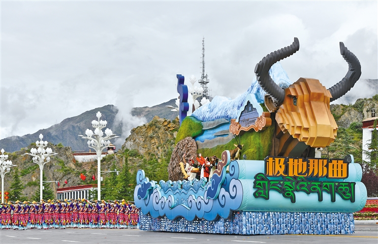 在慶祝大會群眾游行環(huán)節(jié),9輛主題彩車成為最耀眼的明星,與26個群眾方隊一起,組成“旗幟引領”“四件大事”“奮進新時代”“走向未來”四大篇章,在歡快鼓點中徐徐前行,鋪展出一幅流動的新時代雪域長卷。打頭的“旗幟引領”彩車,車頭高擎巨型黨旗,八面五星紅旗緊隨其后,昭示各族兒女永遠心向黨中央。收尾的“走向未來”彩車,車身以數(shù)字“60”為主體,華表、紅飄帶、中國結環(huán)列四周,宣示建設團結富裕文明和諧美麗的社會主義現(xiàn)代化新西藏的堅定決心。首尾呼應的紅色,將整場游行化作一曲感恩奮進的贊歌。