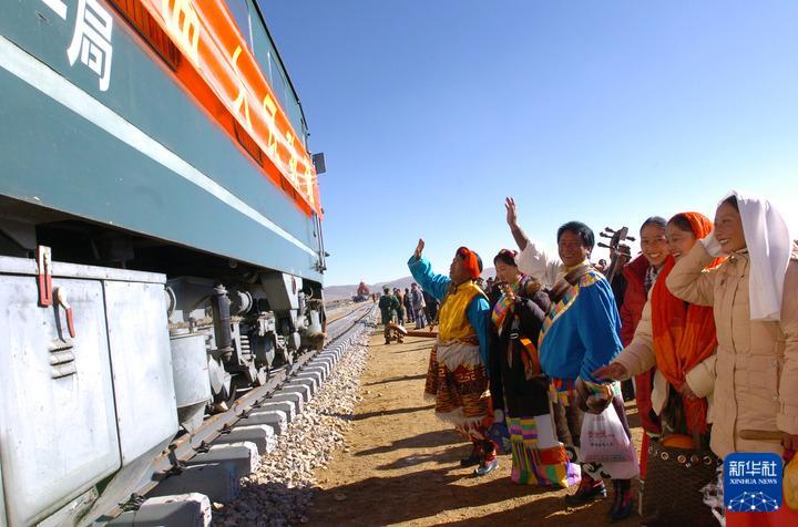 2004年10月10日,藏北群眾迎接火車抵達那曲。10月9日,青藏鐵路安多至那曲138公里鐵軌鋪設(shè)完成。10月10日,從安多出發(fā)的、西藏境內(nèi)第一列火車,于上午10時抵達當時的藏北重鎮(zhèn)——那曲鎮(zhèn)。