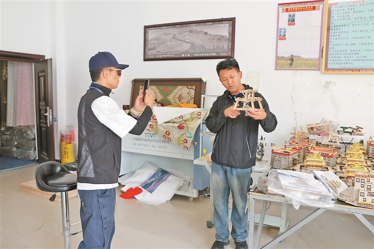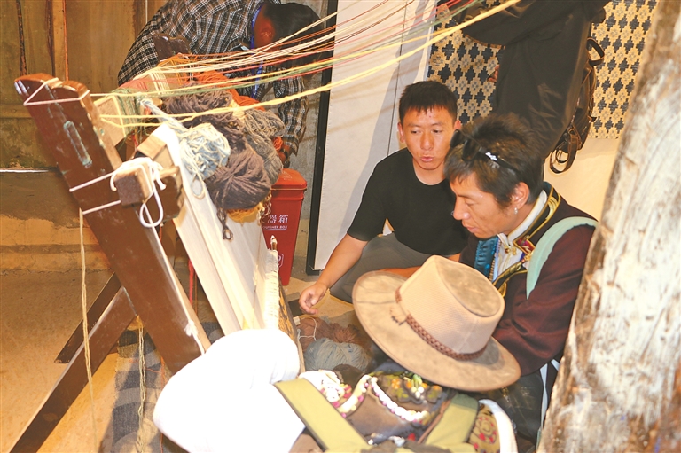 圖為網(wǎng)絡(luò)達人參觀拍攝傳統(tǒng)手工藏毯織造機器。