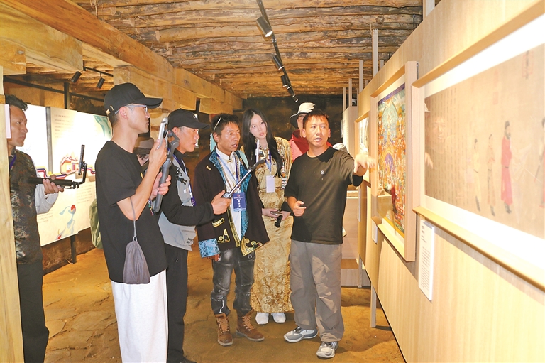 作為瓊結(jié)縣保存完整的傳統(tǒng)莊園,強欽莊園不僅呈現(xiàn)了藏式建筑的獨特格局,還陳列了大量近代西藏社會生產(chǎn)生活實物?!懊恳桓玖?、每一幅展板都在講述歷史。比如這幅青稞收割圖,與今日瓊結(jié)的農(nóng)耕景象自然呼應(yīng),可見文化傳承從未斷絕?!睆堈Z洵一邊拍攝,一邊向直播間網(wǎng)友娓娓道來。