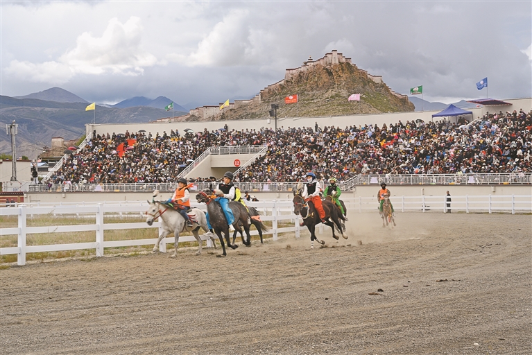 開幕式上,100位騎手策馬奔騰,繞場(chǎng)致意。隨后,擊鼓迎賓、紅色鼓陣、車仁望果、千年名城、英雄江孜、青稞之鄉(xiāng)等10個(gè)方隊(duì)和來(lái)自各鄉(xiāng)鎮(zhèn)的賽馬隊(duì)依次入場(chǎng),全方位、多角度展示了江孜縣特色產(chǎn)業(yè)興旺、基礎(chǔ)設(shè)施提升、民生持續(xù)改善的美好圖景,展現(xiàn)了新時(shí)代英雄城兒女堅(jiān)韌不拔、昂揚(yáng)向上的精神風(fēng)貌,深情表達(dá)了江孜人民對(duì)黨的無(wú)限感恩、對(duì)祖國(guó)的無(wú)限熱愛、對(duì)西藏繁榮發(fā)展的美好祝愿。