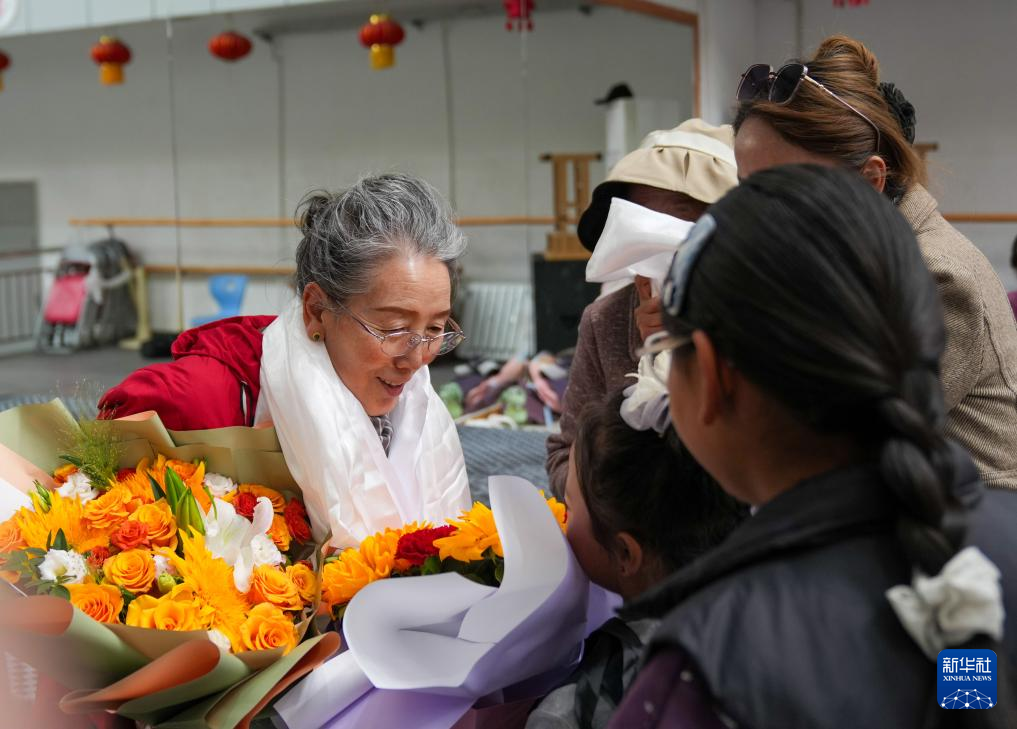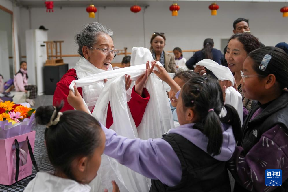 9月14日,學(xué)藏戲的孩子們在給巴桑老師獻花,送上遲到的教師節(jié)祝福。新華社記者 晉美多吉 攝