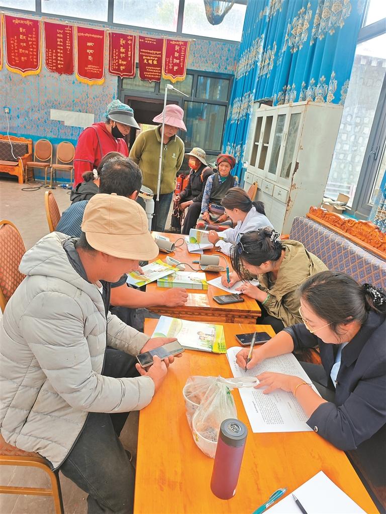 “五彩梅朵·曲水心橋”志愿服務隊耐心為村民組長講解政策。