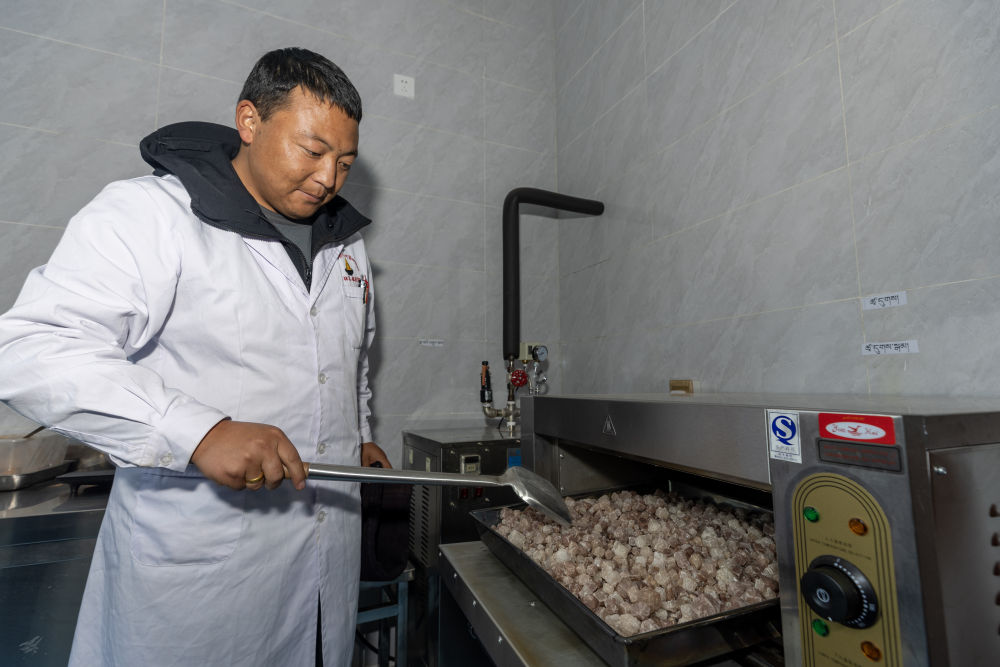 村民索朗美朵自公司成立起就在此工作,是一名包裝工,“有了穩(wěn)定收入,還能照顧家庭,明年準(zhǔn)備重建房子”。
